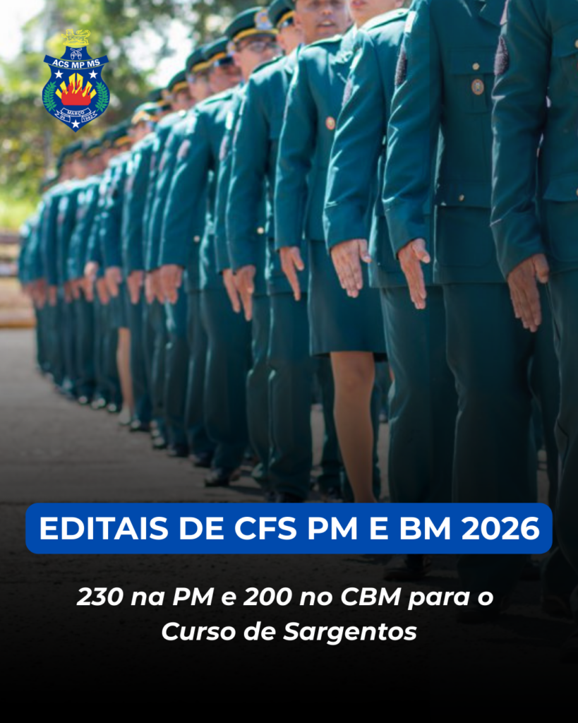 Foram publicados no Diário Oficial Eletrônico nº 12.079, Edição Extra, os editais que abrem Processos Seletivos Internos para ingresso no Curso de Formação de Sargentos 2026 da Polícia Militar e do Corpo de Bombeiros Militar de Mato Grosso do Sul.